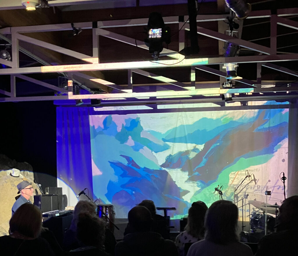 Mein Zeichenlehrer Jürgen Wüst ist auch Musiker und hat zu einer Art Performance eingeladen, wo er zu seinen Musikstücken Videos gedreht hat. Die Videos hat er auf der Bühne live am Keyboard begleitet. Ich war zu sehr mit Schauen beschäftigt und habe vergessen ein Video davon zu machen, also gibt es davon jetzt nur dieses Foto.