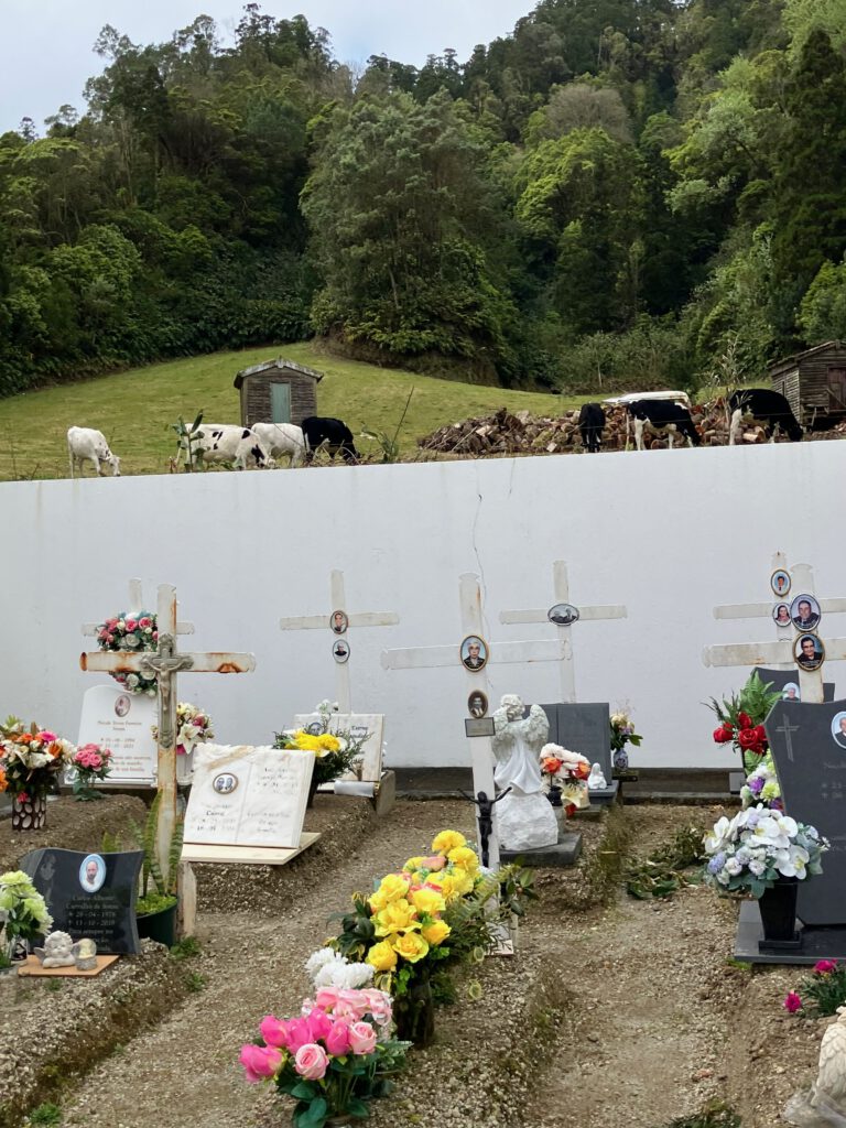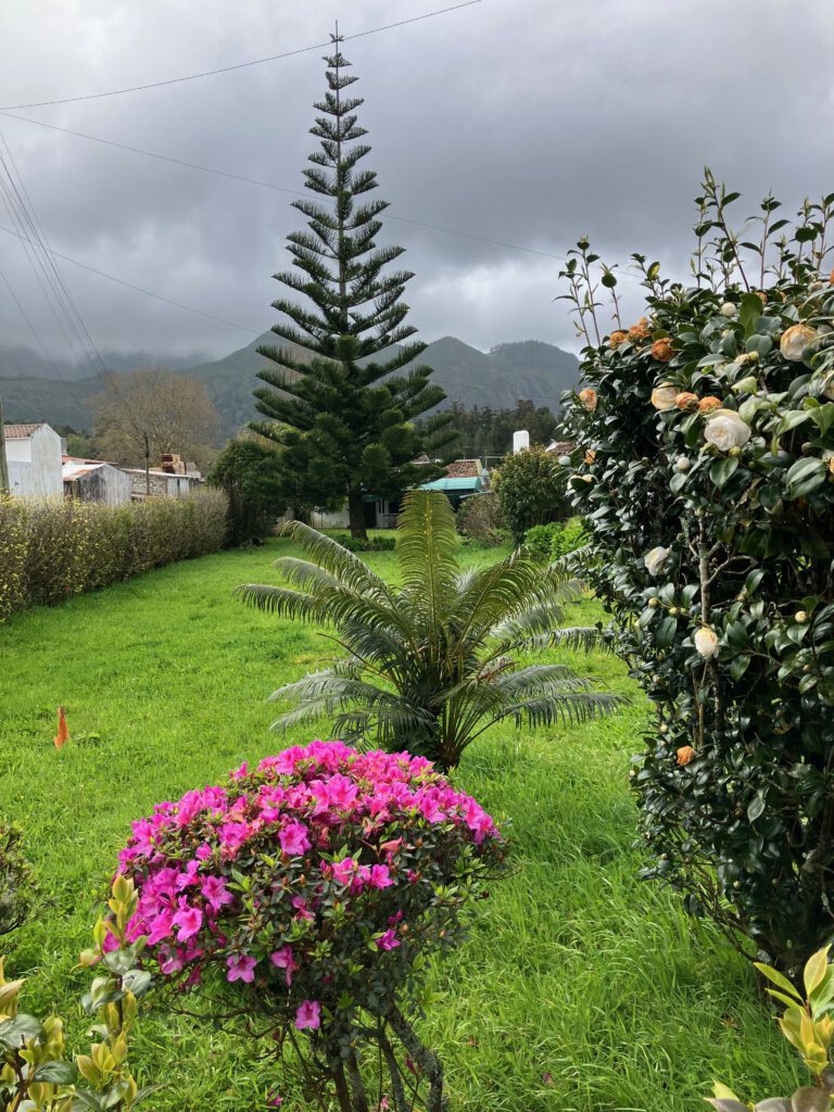 Diese Bilder sind Eindrücke aus einem Dorf im Inselinnern. Selbst die Ruinen sind dort malerischer als anderswo. Nirgendwo liegt Müll herum. Der Friedhof am Dorfrand grenzt an eine Kuhweide und wir haben erfahren, dass es auf den Azoren mehr Rinder als Menschen gibt. Das rechte Bild zeigt eine Neubausiedlung am Ortsrand, wahrscheinlich gab es noch keine Farbe für den Aussenanstrich. Aber viel schöner als die Architektur auf der Insel ist die Botanik. Die Portugiesen haben aus aller Welt Pflanzen auf die Azoren gebracht und so gibt es hier jede Menge wild wachsende Hortensien, die jetzt im April noch nicht blühen. Aber dafür blühen die Azaleen und in den botanischen Gärten, von denen es gleich mehrere in Ponta Delgada gibt, steht so manche Kuriosität.