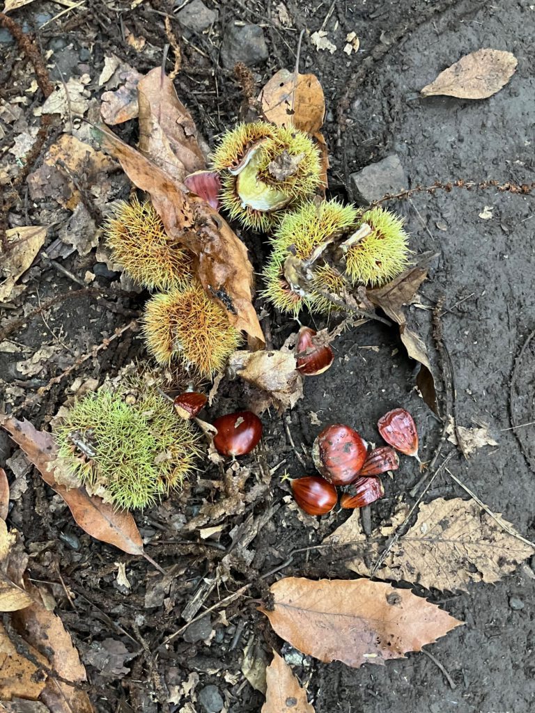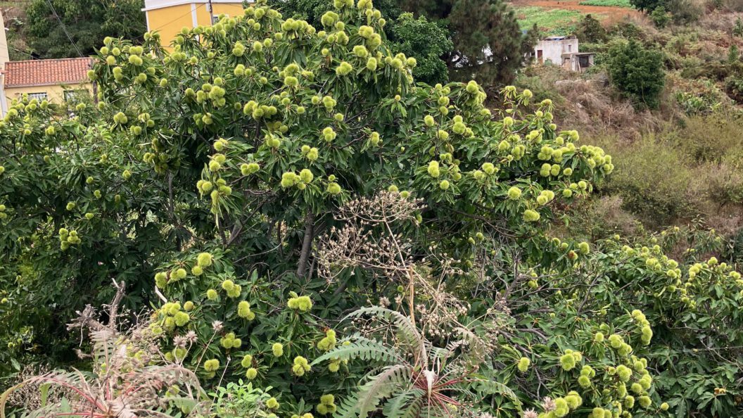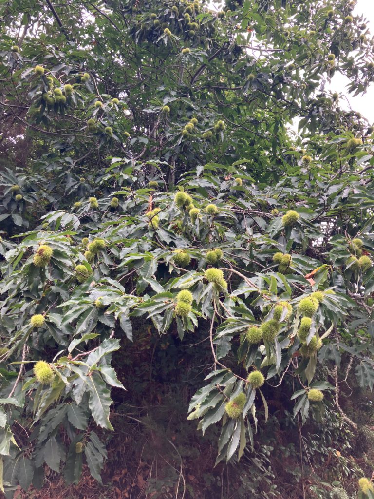 Ja, auch hier gibt es tatsächlich so etwas wie Herbst. Es ist ende Oktober und auf der Ostseite der Insel sind die Esskastanien reif. Das Laub der Bäume hat sich hier noch nicht verfärbt, aber die prallen stacheligen Kapseln mit den Früchten fallen schon herunter.
